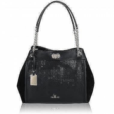 Помимо безусловно практичного дизайна эта вместительная мягкая сумка радует своим привлекательным внешним видом. Комбинированная модель из черной натуральной кожи и замши делится на три отдела. Центральный отдел закрывается на молнию, боковые — на поворотный замочек. Ближний отдел снабжен двумя открытыми кармашками, дальний дополнен карманом на молнии. Сумка удобно носится на плече благодаря длинным ручкам на цепочках.