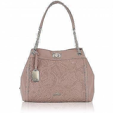 Длинные ручки на цепочках и фигурное тиснение позволяют этой мягкой повседневной сумке выглядеть изящно и привлекательно. Аксессуар цвета какао состоит из трех отделов и выполнен из натуральной кожи. Центральный отдел застегивается молнией, боковые — поворотным замочком. В ближнем отделе размещены два открытых кармашка для телефона и мелочей, в дальнем имеется карман на молнии.